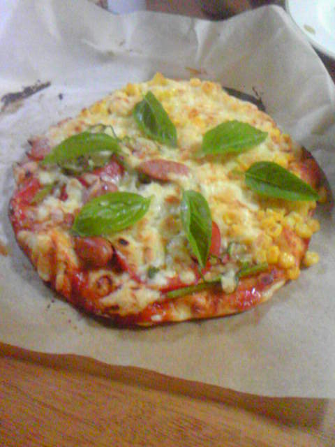 ピザ生地には、オリーブオイルを少し入れると料理集に載っていたのでその方法で作りました。ピザは三枚焼きました。写真のは、コーンとマヨネーズを混ぜたのと、トマトソースに、たまねぎ、唯一自家製のピーマン、ウインナーのハーフ&ハーフに近所の方から頂いたバジルを使用しました。おいしそうにできたぞ~。ピザはあつあつ、カリカリでおいしい。三枚ともあっと言う間になくなりました。